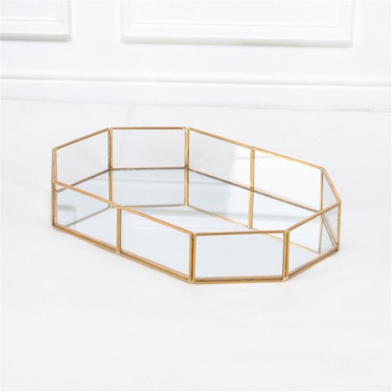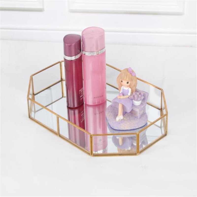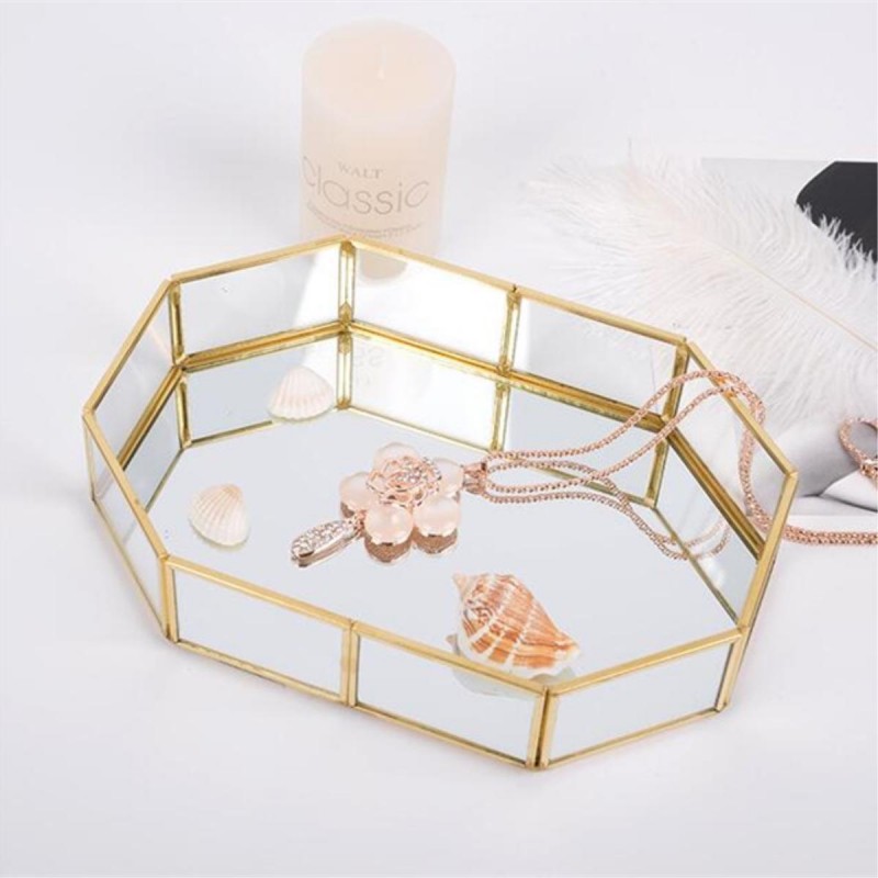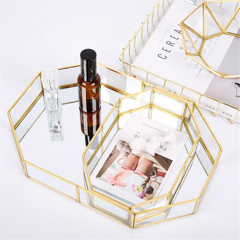 2 Size Mirror Glass Tray Octagon Cosmetic Makeup Desktop Organizer Jewelry Display Stand Holder - M